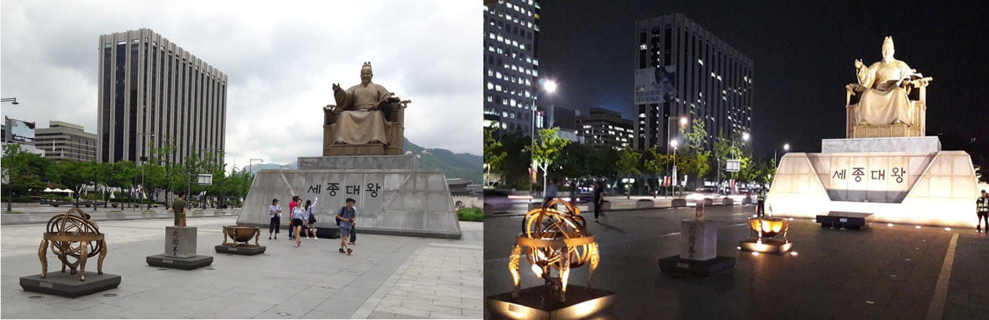 한때는 직장이 근처라 매일 오가던 광화문 광장을 날도 좋아 오랜만에 여기저기 돌아다녔습니다. 광화문 광장에는 행사도, 집회도 많고 볼거리도 많은 곳입니다. 그곳에는 언제 보아도 든든하고 온 국민이 사랑하는 세종대왕님 동상이 있습니다. 세종대왕님 앞으로는 전체 관측기구 '혼천의', 강우량을 측정할 수 있는 '측우기', 해시계, 세종대왕님이 백성을 가르치는 바른 소리라는 뜻으로 만드신 '훈민정음'이 줄을 지어 있습니다. 그리고 이 세종대왕 동상 뒤편에는 세종대왕님 전시관을 구경할 수 있는 입구가 있습니다. 전시관에 내부와 진열품을 통해 세종대왕님의 업적을 살펴보도록 하겠습니다.