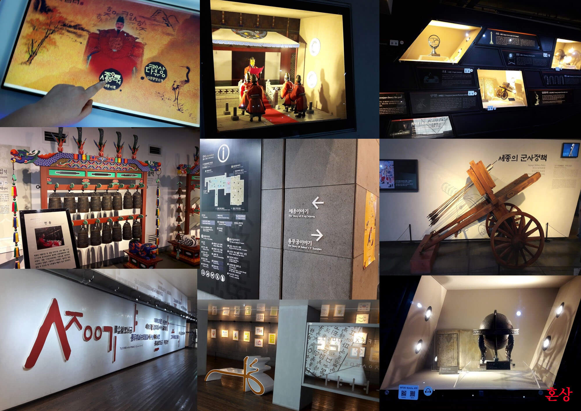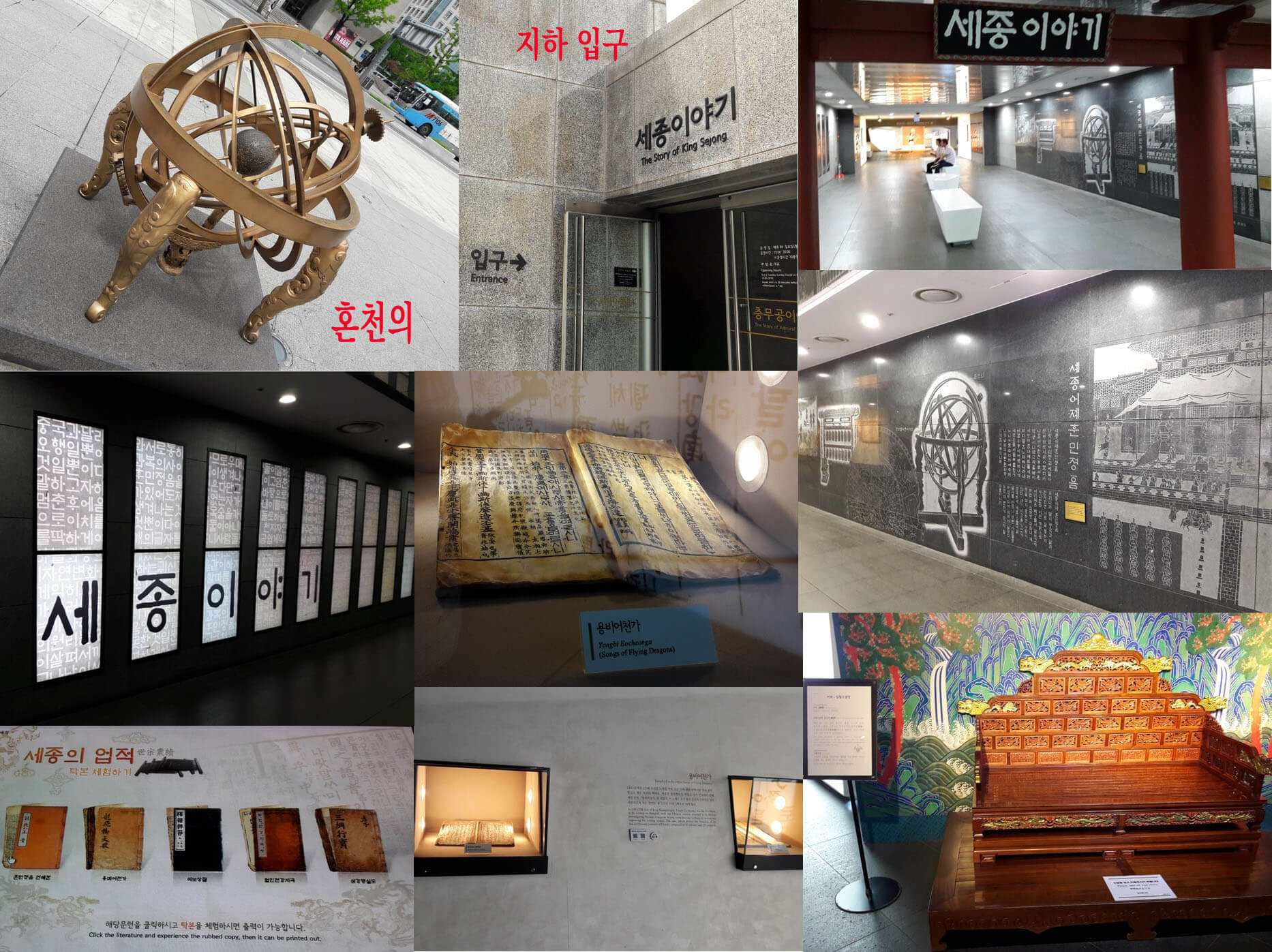 입구 지하로 내려가면 첨단의 전시관이 깜짝 놀랄 만큼 쾌적한 환경으로 잘 전시되어 있습니다. 입구에는 독도의 상황을 실시간 영상으로 소개해 주고 있습니다. 천천히 내부를 구경하다 보면 우리가 배우고 알고 있다고 생각했지만 관심을 갖고 보니 더욱 세종대왕님의 업적에 절로 고개가 숙여졌습니다. 그리고 전시관에는 그의 업적들이 쉽고 상세히 그리고 멋있게 진열되거나 상영되고 있습니다. 벽면 한쪽에 큰 화면으로 영상이 상영되고 앞에는 앉아서 볼 수 있는 의자도 있으니 편하게 감상할 수 있습니다. 전시관 중간 여러 곳에 잠시 쉬어 갈 수 있는 공간도 한글을 응용에 이쁘게 마련되어 있습니다. 영상을 보고 있자니 세종대왕이 얼마나 백성을 가엾이 여기고 사랑하셨는지 '애민 정책'을 보며 감동받아 울컥했습니다. 학교 다닐 때 배웠지만 이렇게 보니 더욱 새로웠습니다. 이 전시관이 잘되어 있는 것이 많은 부분이 체험이 가능하도록 첨단으로 되었다는 겁니다. 탁본 체험관을 비롯해 '용상'에서 사진 촬영도 할 수 있게 마련되어 있고 어린이들은 선비복도 대여해서 체험할 수 있도록 재미있게 구성되어 있습니다. 세종대왕 영상관, 한글 체험관, 게임관등 다양하게 구성되어 있습니다. 알고 싶은 내용들은 3D로 볼 수도 있습니다.