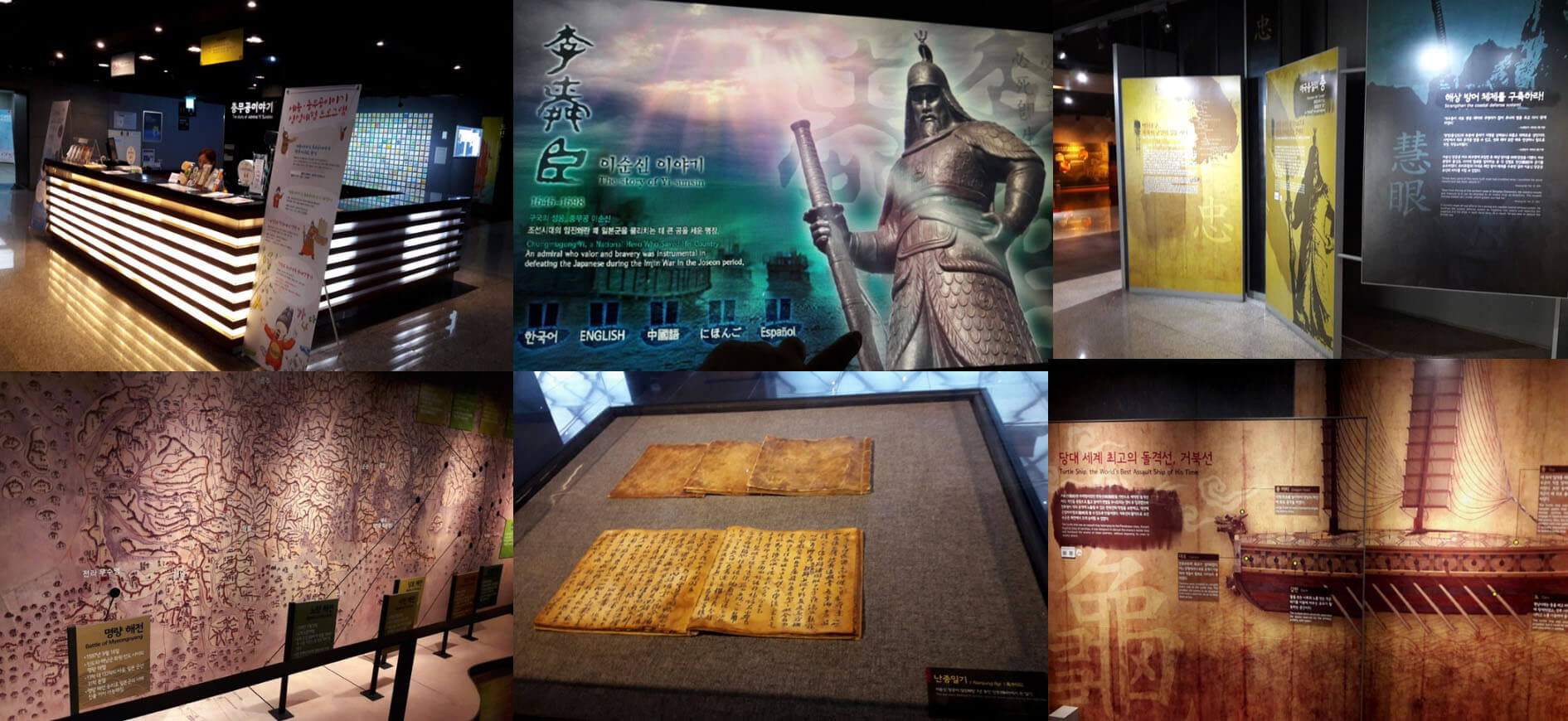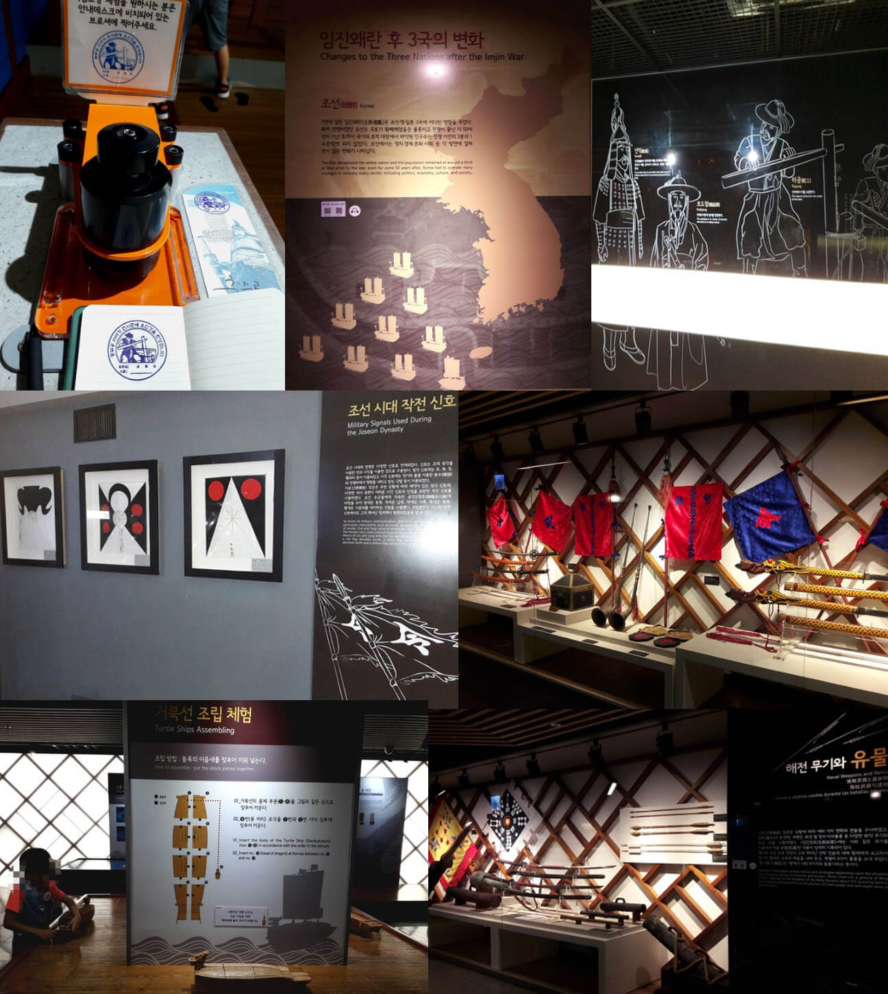전시관을 들어서면 넓은 지하의 쾌적함과 알찬 내용에 놀라게 됩니다. 입구에는 안내 데스크가 있고 이곳에서 다양한 체험 신청과 안내를 받으실 수 있습니다. 먼저 큰 스크린에 이순신 장군의 일대기를 영상으로 보실 수 있습니다. 전시물 중에는 이순신 장군의 난중일기를 보실 수 있는데 장군님의 강인한 필체에서 그 힘을 느껴 보실 수 있습니다. 당시 군사 작전판을 보는 듯한 해전 지도와 전투 장면을 스크린으로 생생히 체험할 수 있습니다. 입체적으로 배 모형이 진열되어 있는데 영화는 4d로 되어있어 전투 장면 영상은 끝까지 보시길 바랍니다. 너무 길지 않은 영상이니 끝까지 감상하신다면 멋진 장면을 볼 수 있습니다. 여러 자료 중에 조선, 명나라, 일본 3국의 전투함을 비교해 놓은 전시물이 있는데 그림과 함께 보면 그 위대함이 더욱 실감 납니다. 이 모든 내용은 오디오로 들을 수 있게 되어 있고 한국어, 영어, 일본어, 중국어, 스페인어등 5개 국어 지원이 가능합니다. 당시의 사용된 여러 무기류와 유물들도 전시되어 있는데 이순신 장군님이 실제 사용하셨거나 부하에게 하사 하신 검들이 전시되어 있습니다. 그 크기가 2M나 되고 굉장해서 이 검을 들고 어떻게 싸우셨을까? 하는 의문까지 들정도입니다. 전투 시 사용했던 깃발과 화살, 포 등 무기도 소개되어 있습니다. 전시 시 작전 신호로 쓴 '연'들 이 전열 되어 있는데 이 디자인이 너무 이뻐 마치 갤러리 예술작품을 보는 것 같았습니다. 또 다양한 내용으로 체험할 수 있는 것들이 많이 준비되어 있습니다. 4D영상체험관, 수군 무기 체험, 총쏘기, 노젓기 게임, 거북선 나무 도형 조립등이 있고 전투 진형 퍼즐은 게임형식으로 되어 있습니다. 이순신 전시관 기념 도장도 있어 찍어 볼 수 있습니다.